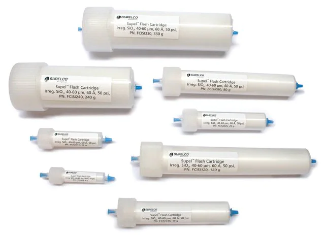 | General description【一般描述】 | Supel™Flash Cartridges SupelFlash cartridges are pre-compressed, disposable flash columns containing ultrapure silica, designed to meet your stringent flash purification requirements. Cartridge pre-compression reduces particle interstitial spacing to provide even mass transfer and balanced chemical interaction. Features Include: Female luer lock inlet and male slip luer outlet for easy compatibility 8 Bed weights from 4 grams to 330 grams 40-60 um irregular silica Higher efficiency leading to sharper more symmetric peaks High yield and sample loading capacity Reliable, consistent purification performance Supel Flash Cartridges are Designed For Use in: ISCO′s CombiFlash, Companion, Retrieve, and OptiX systems; Analogix′s SimpliFlash, and IntelliFlash and Biotage systems. |